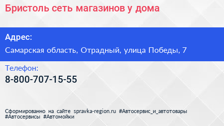 Бристоль, сеть магазинов у дома по адресу Самарская область, Отрадный, улица Победы, 7 в дальнейшем Организация, размещена в следующих категориях: