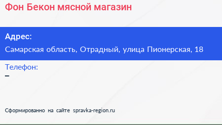 Фон Бекон, мясной магазин по адресу Самарская область, Отрадный, улица Пионерская, 18 в дальнейшем Организация, размещена в следующих категориях: