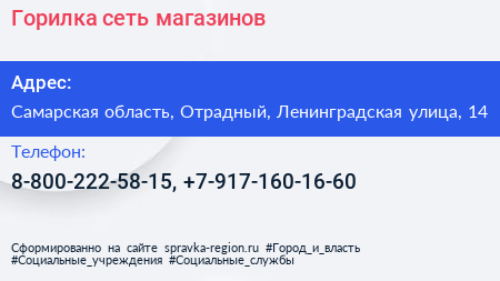 Горилка, сеть магазинов по адресу Самарская область, Отрадный, Ленинградская улица, 14 в дальнейшем Организация, размещена в следующих категориях: