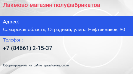 Лакмово, магазин полуфабрикатов по адресу Самарская область, Отрадный, улица Нефтянников, 90 в дальнейшем Организация, размещена в следующих категориях:
