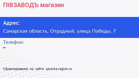 ПIВЗАВОДЪ, магазин по адресу Самарская область, Отрадный, улица Победы, 7 в дальнейшем Организация, размещена в следующих категориях: