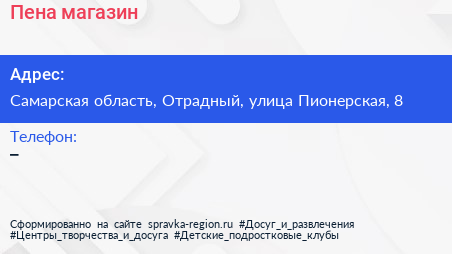 Пена, магазин по адресу Самарская область, Отрадный, улица Пионерская, 8 в дальнейшем Организация, размещена в следующих категориях: