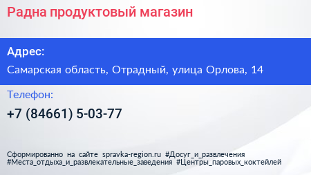 Радна, продуктовый магазин по адресу Самарская область, Отрадный, улица Орлова, 14 в дальнейшем Организация, размещена в следующих категориях: