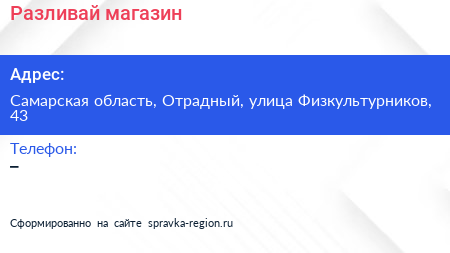 Разливай, магазин по адресу Самарская область, Отрадный, улица Физкультурников, 43 в дальнейшем Организация, размещена в следующих категориях: