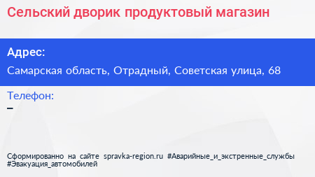 Сельский дворик, продуктовый магазин по адресу Самарская область, Отрадный, Советская улица, 68 в дальнейшем Организация, размещена в следующих категориях:
