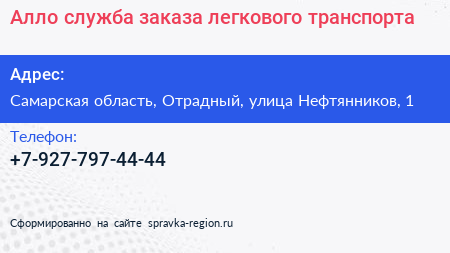 Алло, служба заказа легкового транспорта по адресу Самарская область, Отрадный, улица Нефтянников, 1 в дальнейшем Организация, размещена в следующих категориях: