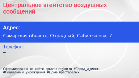 Центральное агентство воздушных сообщений по адресу Самарская область, Отрадный, Сабирзянова, 7 в дальнейшем Организация, размещена в следующих категориях:
