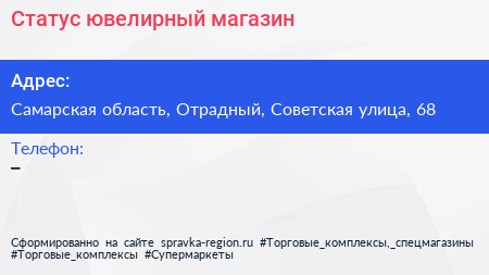 Статус, ювелирный магазин по адресу Самарская область, Отрадный, Советская улица, 68 в дальнейшем Организация, размещена в следующих категориях: