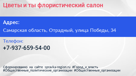 Цветы и ты, флористический салон по адресу Самарская область, Отрадный, улица Победы, 34 в дальнейшем Организация, размещена в следующих категориях: