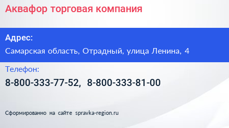 Аквафор, торговая компания по адресу Самарская область, Отрадный, улица Ленина, 4 в дальнейшем Организация, размещена в следующих категориях: