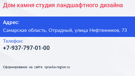 Дом камня, студия ландшафтного дизайна по адресу Самарская область, Отрадный, улица Нефтянников, 73 в дальнейшем Организация, размещена в следующих категориях: