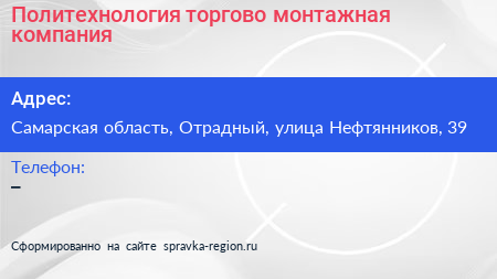 Политехнология, торгово-монтажная компания по адресу Самарская область, Отрадный, улица Нефтянников, 39 в дальнейшем Организация, размещена в следующих категориях: