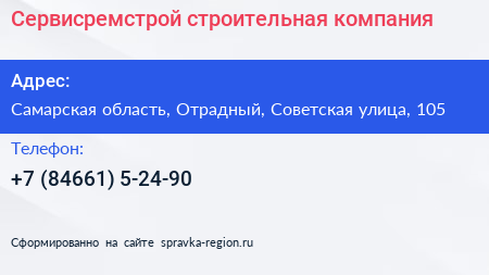 Сервисремстрой, строительная компания по адресу Самарская область, Отрадный, Советская улица, 105 в дальнейшем Организация, размещена в следующих категориях: