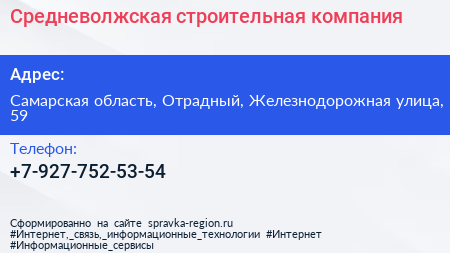Средневолжская строительная компания по адресу Самарская область, Отрадный, Железнодорожная улица, 59 в дальнейшем Организация, размещена в следующих категориях: