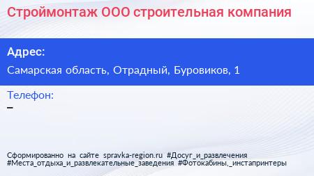 Строймонтаж, ООО, строительная компания по адресу Самарская область, Отрадный, Буровиков, 1 в дальнейшем Организация, размещена в следующих категориях: