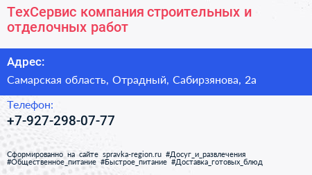 ТехСервис, компания строительных и отделочных работ по адресу Самарская область, Отрадный, Сабирзянова, 2а в дальнейшем Организация, размещена в следующих категориях: