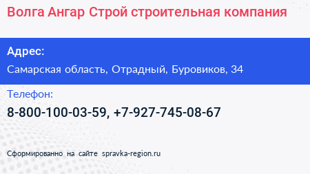 Волга Ангар Строй, строительная компания по адресу Самарская область, Отрадный, Буровиков, 34 в дальнейшем Организация, размещена в следующих категориях: