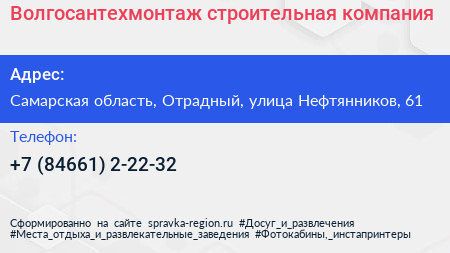 Волгосантехмонтаж, строительная компания по адресу Самарская область, Отрадный, улица Нефтянников, 61 в дальнейшем Организация, размещена в следующих категориях: