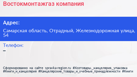 Востокмонтажгаз, компания по адресу Самарская область, Отрадный, Железнодорожная улица, 54 в дальнейшем Организация, размещена в следующих категориях: