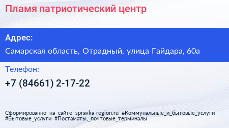 Пламя, патриотический центр по адресу Самарская область, Отрадный, улица Гайдара, 60а в дальнейшем Организация, размещена в следующих категориях:
