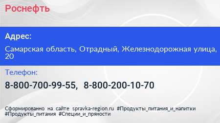 Роснефть по адресу Самарская область, Отрадный, Железнодорожная улица, 20 в дальнейшем Организация, размещена в следующих категориях: