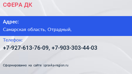 СФЕРА ДК по адресу Самарская область, Отрадный, в дальнейшем Организация, размещена в следующих категориях: