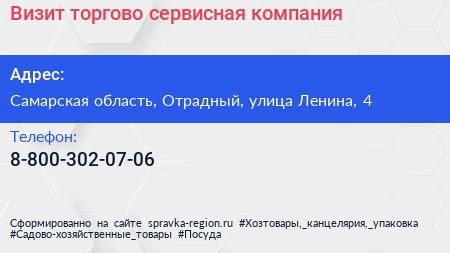 Визит, торгово-сервисная компания по адресу Самарская область, Отрадный, улица Ленина, 4 в дальнейшем Организация, размещена в следующих категориях: