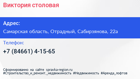 Виктория, столовая по адресу Самарская область, Отрадный, Сабирзянова, 22а в дальнейшем Организация, размещена в следующих категориях: