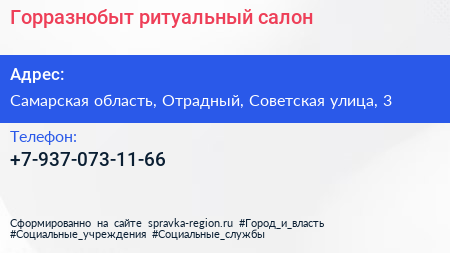 Горразнобыт, ритуальный салон по адресу Самарская область, Отрадный, Советская улица, 3 в дальнейшем Организация, размещена в следующих категориях: