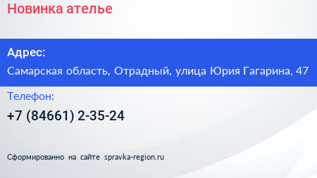 Новинка, ателье по адресу Самарская область, Отрадный, улица Юрия Гагарина, 47 в дальнейшем Организация, размещена в следующих категориях: