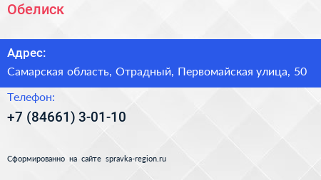 Обелиск по адресу Самарская область, Отрадный, Первомайская улица, 50 в дальнейшем Организация, размещена в следующих категориях:
