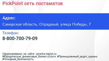 PickPoint, сеть постаматов по адресу Самарская область, Отрадный, улица Победы, 7 в дальнейшем Организация, размещена в следующих категориях:
