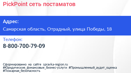 PickPoint, сеть постаматов по адресу Самарская область, Отрадный, улица Победы, 18 в дальнейшем Организация, размещена в следующих категориях: