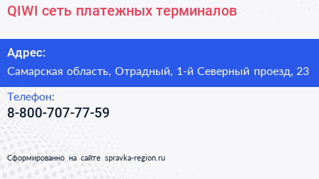 QIWI, сеть платежных терминалов по адресу Самарская область, Отрадный, 1-й Северный проезд, 23 в дальнейшем Организация, размещена в следующих категориях: