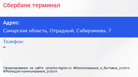 Сбербанк, терминал по адресу Самарская область, Отрадный, Сабирзянова, 7 в дальнейшем Организация, размещена в следующих категориях: