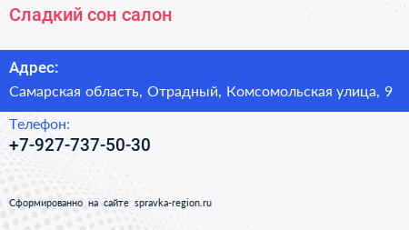 Сладкий сон, салон по адресу Самарская область, Отрадный, Комсомольская улица, 9 в дальнейшем Организация, размещена в следующих категориях: