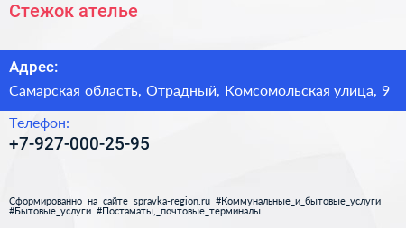 Стежок, ателье по адресу Самарская область, Отрадный, Комсомольская улица, 9 в дальнейшем Организация, размещена в следующих категориях: