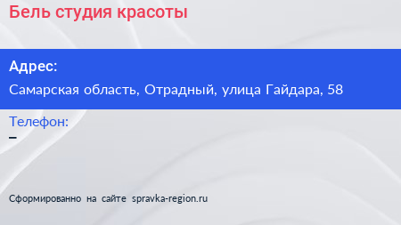 Бель, студия красоты по адресу Самарская область, Отрадный, улица Гайдара, 58 в дальнейшем Организация, размещена в следующих категориях: