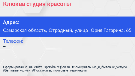 Клюква, студия красоты по адресу Самарская область, Отрадный, улица Юрия Гагарина, 65 в дальнейшем Организация, размещена в следующих категориях: