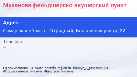 Муханова фельдшерско-акушерский пункт по адресу Самарская область, Отрадный, Больничная улица, 22 в дальнейшем Организация, размещена в следующих категориях: