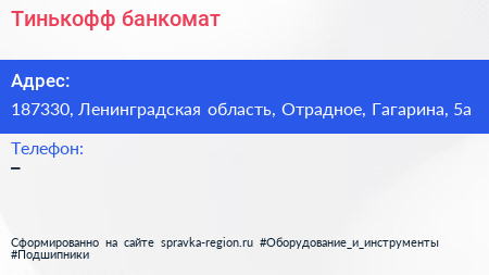 Тинькофф, банкомат по адресу 187330, Ленинградская область, Отрадное, Гагарина, 5а в дальнейшем Организация, размещена в следующих категориях: