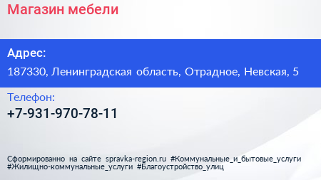 Магазин мебели по адресу 187330, Ленинградская область, Отрадное, Невская, 5 в дальнейшем Организация, размещена в следующих категориях: