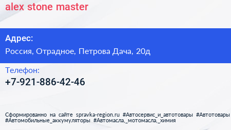 alex.stone.master по адресу 41К-312, Щербинка, посёлок имени Свердлова, Свердловское городское поселение, Всеволожский район, Ленинградская область, Северо-Западный федеральный округ, 188683, Россия в дальнейшем Организация, размещена в следующих категориях: