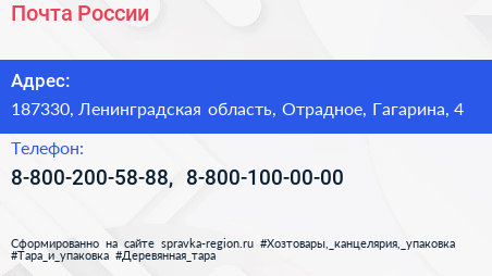Почта России по адресу 187330, Ленинградская область, Отрадное, Гагарина, 4 в дальнейшем Организация, размещена в следующих категориях: