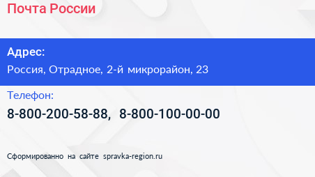 Почта России по адресу 23, 2-й микрорайон, посёлок имени Свердлова, Свердловское городское поселение, Всеволожский район, Ленинградская область, Северо-Западный федеральный округ, 188683, Россия в дальнейшем Организация, размещена в следующих категориях: