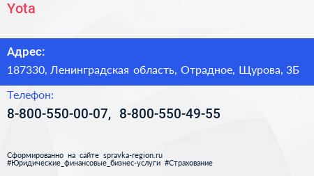 Yota по адресу 187330, Ленинградская область, Отрадное, Щурова, 3Б в дальнейшем Организация, размещена в следующих категориях: