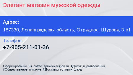 Элегант, магазин мужской одежды по адресу 187330, Ленинградская область, Отрадное, Щурова, 3 к1 в дальнейшем Организация, размещена в следующих категориях: