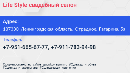 Life Style, свадебный салон по адресу 187330, Ленинградская область, Отрадное, Гагарина, 5а в дальнейшем Организация, размещена в следующих категориях: