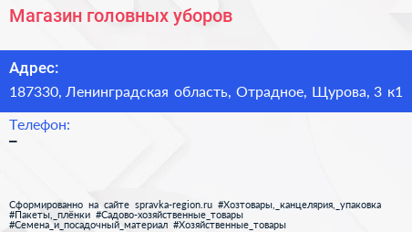 Магазин головных уборов по адресу 187330, Ленинградская область, Отрадное, Щурова, 3 к1 в дальнейшем Организация, размещена в следующих категориях: