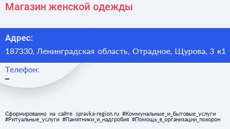 Магазин женской одежды по адресу 187330, Ленинградская область, Отрадное, Щурова, 3 к1 в дальнейшем Организация, размещена в следующих категориях: